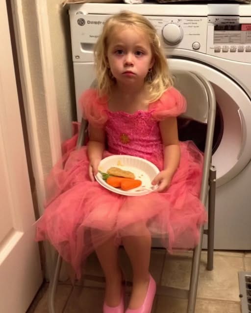 I followed her gesture and my heart sank. There, in the laundry room between a basket of dirty towels and the humming dryer, sat a metal folding chair. Ivy sat there, holding a flimsy paper plate with two baby carrots and a dinner roll.
